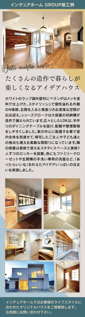 ホワイトのラップ調外壁とメッキ塗料のベランダが個性を演出するN様邸。広々LDKや造作収納、家族で使えるスタディスペースなど、快適で機能的な間取りが魅力の住まいです。