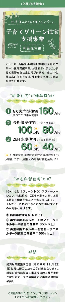 2025年、新築向けの補助金制度「子育てグリーン住宅支援事業」が発表されました。子育て世帯を含む全世帯が対象で、省エネ性能の高い住宅を支援。補助金を活用し、新築が建てられます。