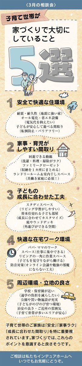 子育て世帯の家づくりで大切な5つのポイントは、安全で快適な住環境、家事・育児がしやすい間取り、成長に合わせた工夫、在宅ワークの快適さ、立地の良さ。これらを意識することで、後悔のない住まいを実現できます!