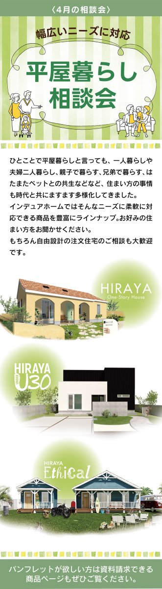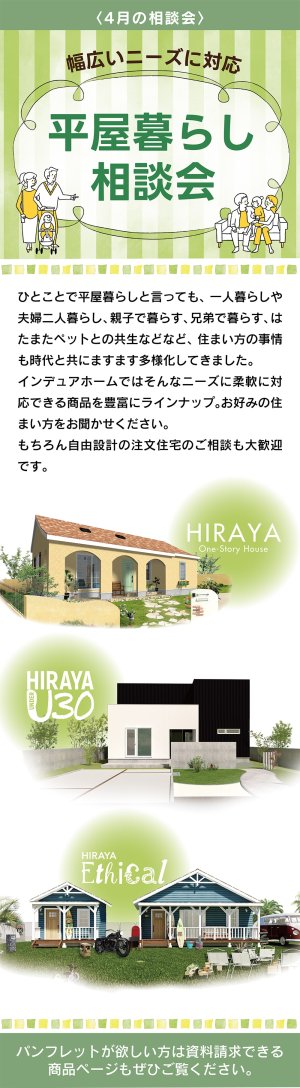 平屋暮らしのスタイルは多様化。単身や夫婦、家族、ペットとの暮らしなど、ニーズに合わせた住まいを提案。インデュアホームは豊富なラインナップで対応し、自由設計の注文住宅もご相談可能。理想の住まいを実現!